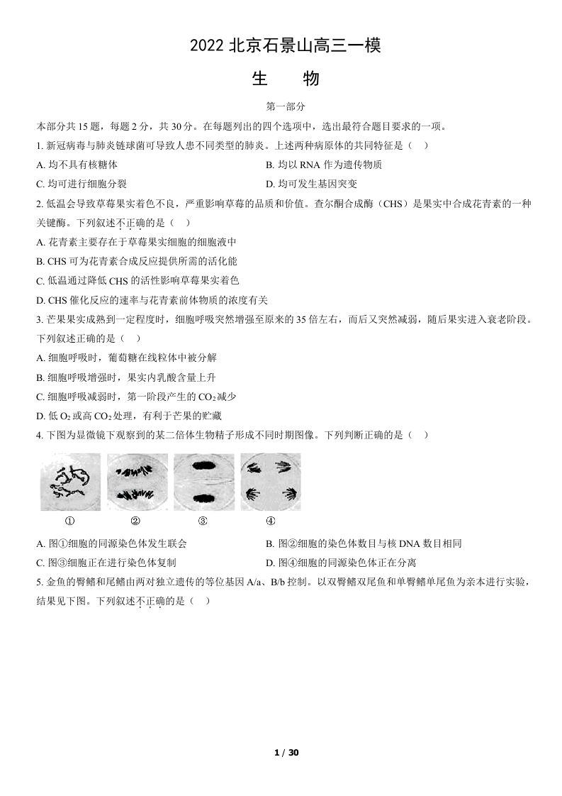 2022年北京石景山高三一模生物试卷(有答案)