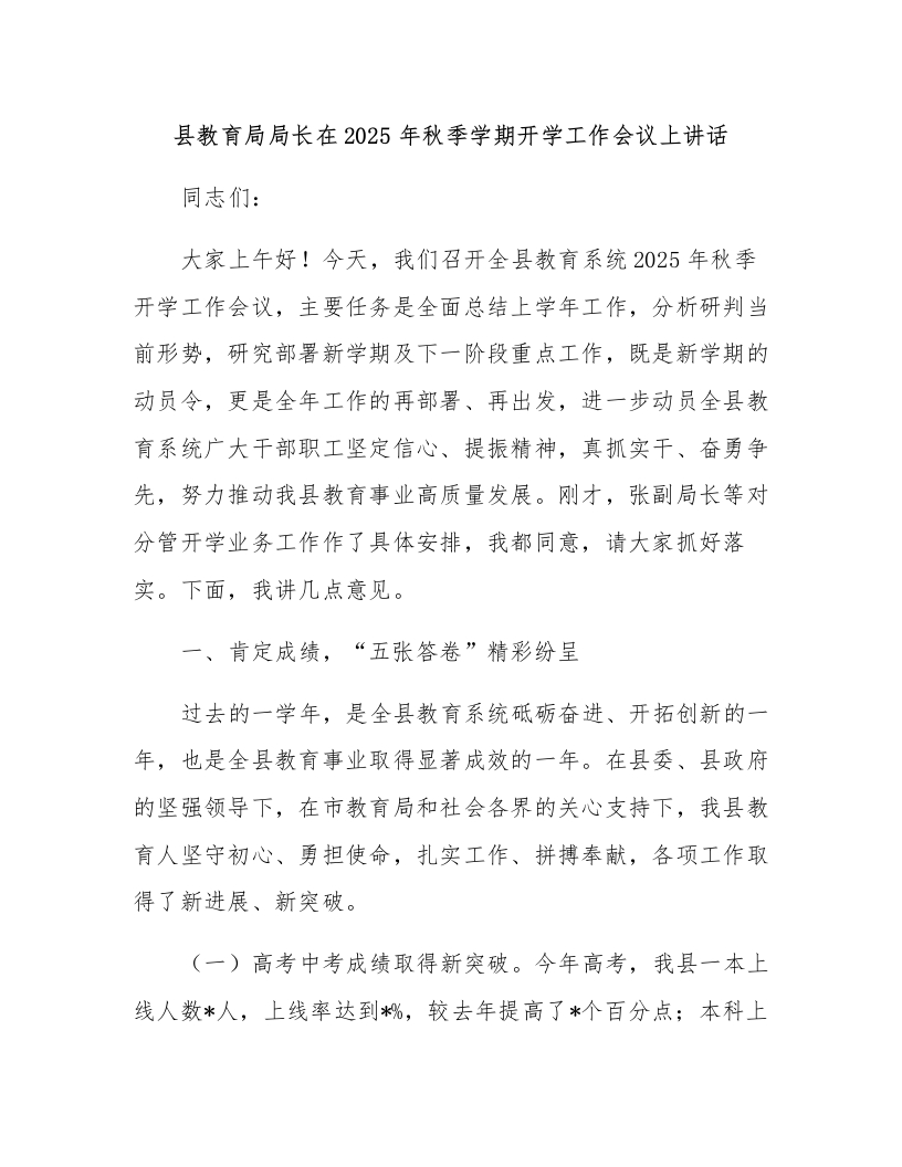 首页党建资料讲稿讲话县教育局局长在2025年秋季学期开学工作会议上讲话