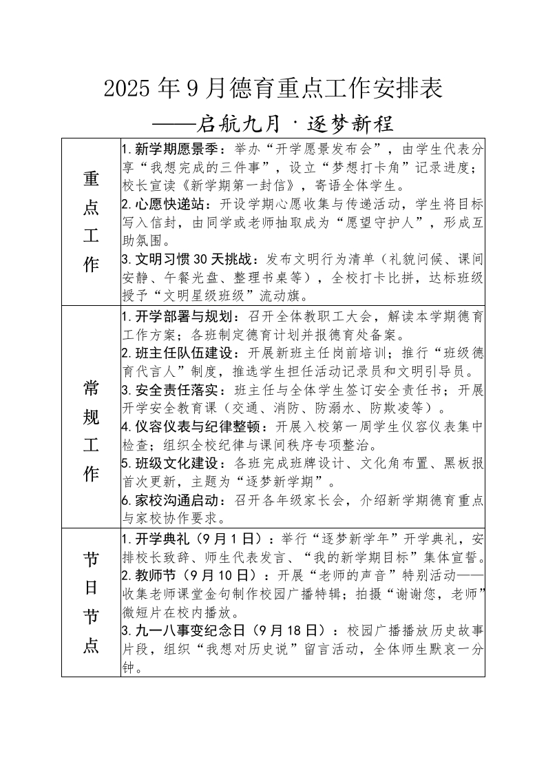 2025年秋季9月-2026-1月德育重点工作安排表