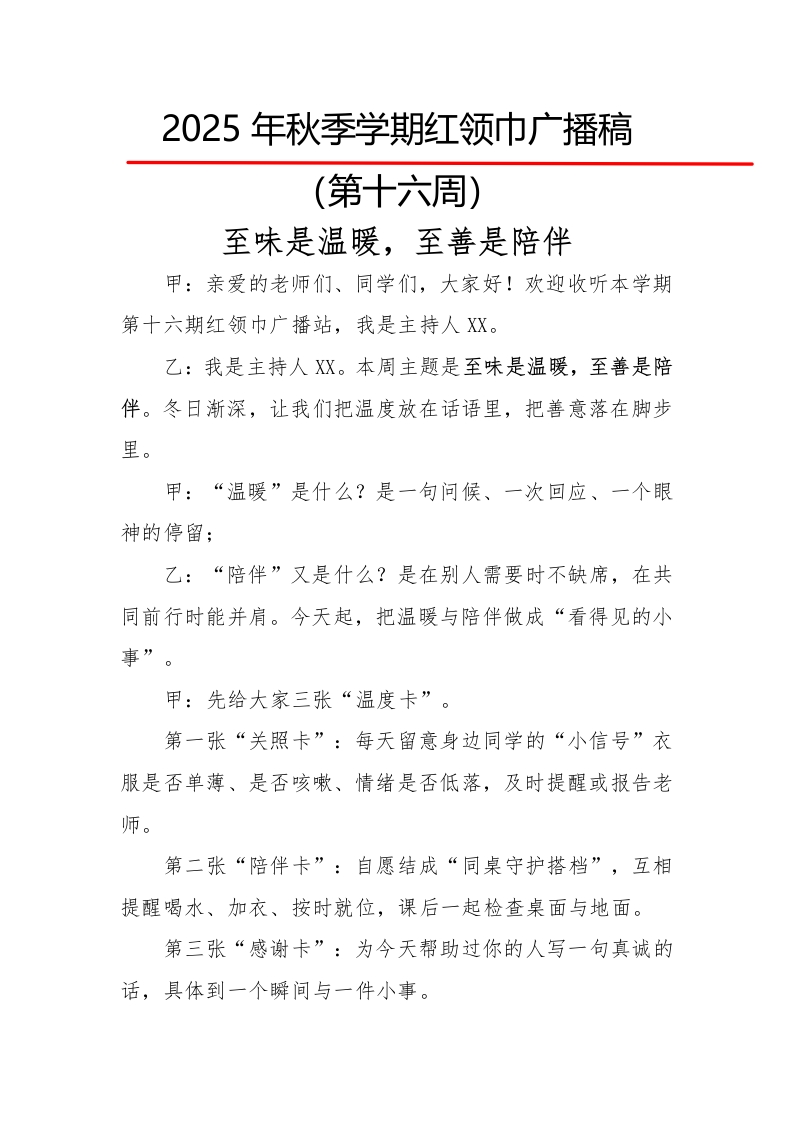 2025年秋季第一学期红领巾广播稿(22周):第16周 至味是温暖,至善是陪伴