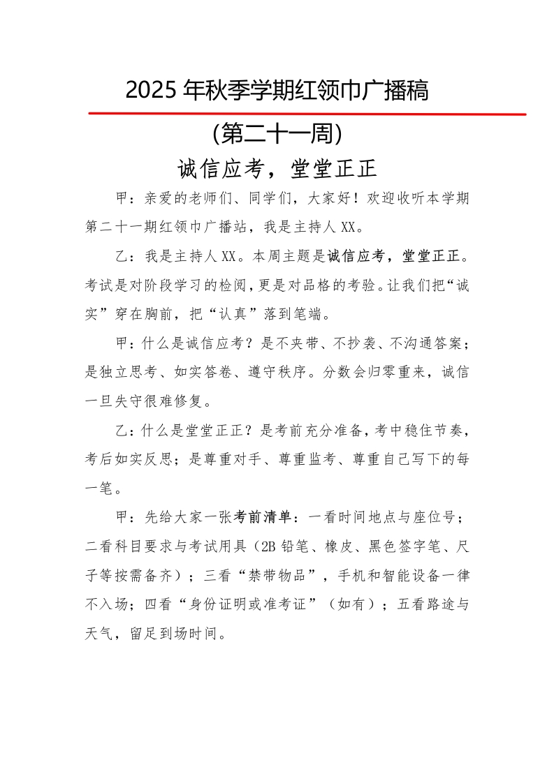 2025年秋季第一学期红领巾广播稿(22周):第21周 诚信应考,堂堂正正