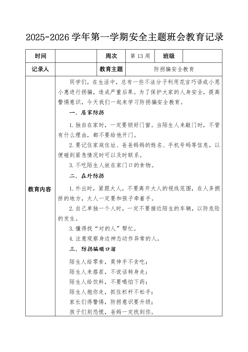 2025-2026秋季学年第一学期安全主题班会教育记录(22周):第13周 防拐骗安全教育