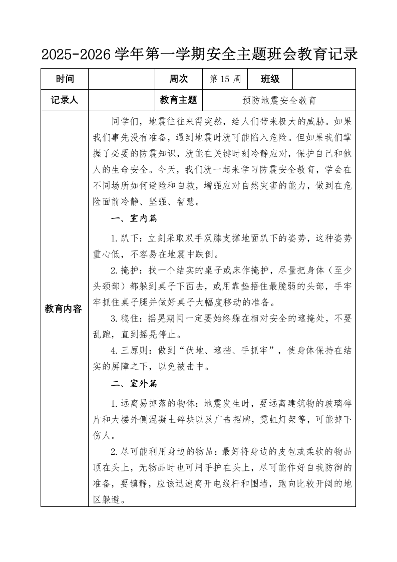 2025-2026秋季学年第一学期安全主题班会教育记录(22周):第15周 防震安全教育