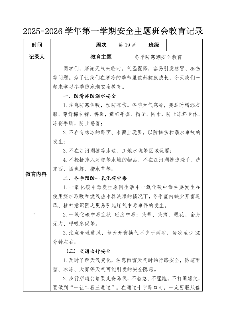 2025-2026秋季学年第一学期安全主题班会教育记录(22周):第19周 冬季防寒潮安全教育