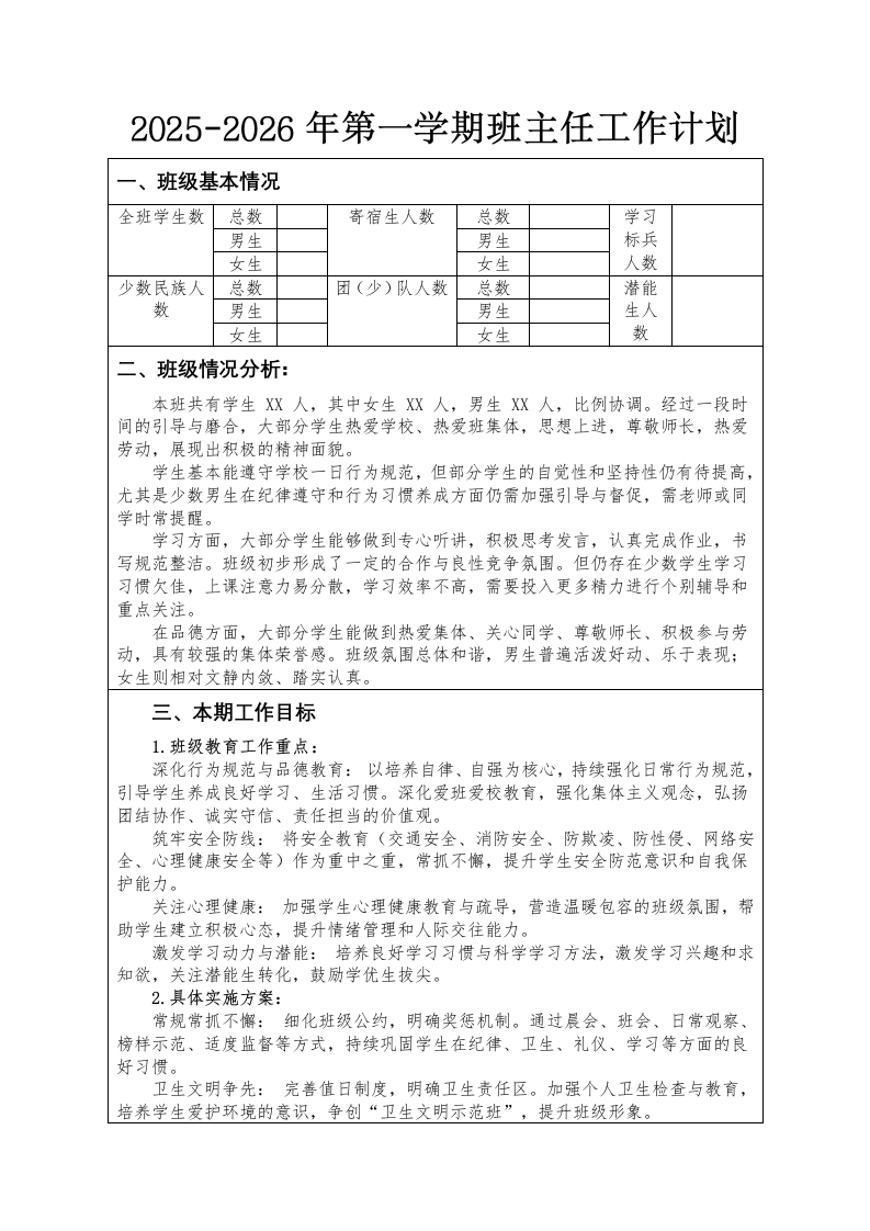 2025-2026秋季学年度第一学期班主任工作计划(表格版)