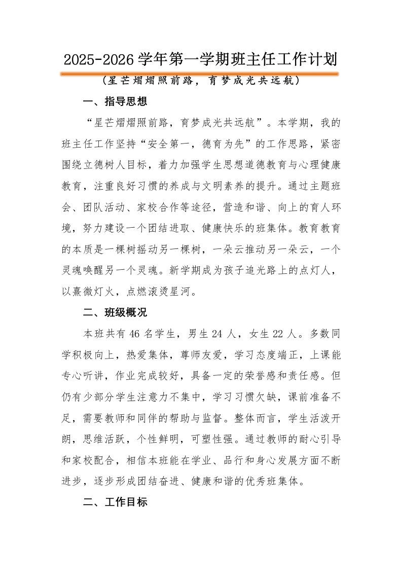2025-2026学年第一学期班主任工作计划:星芒熠熠照前路,育梦成光共远航